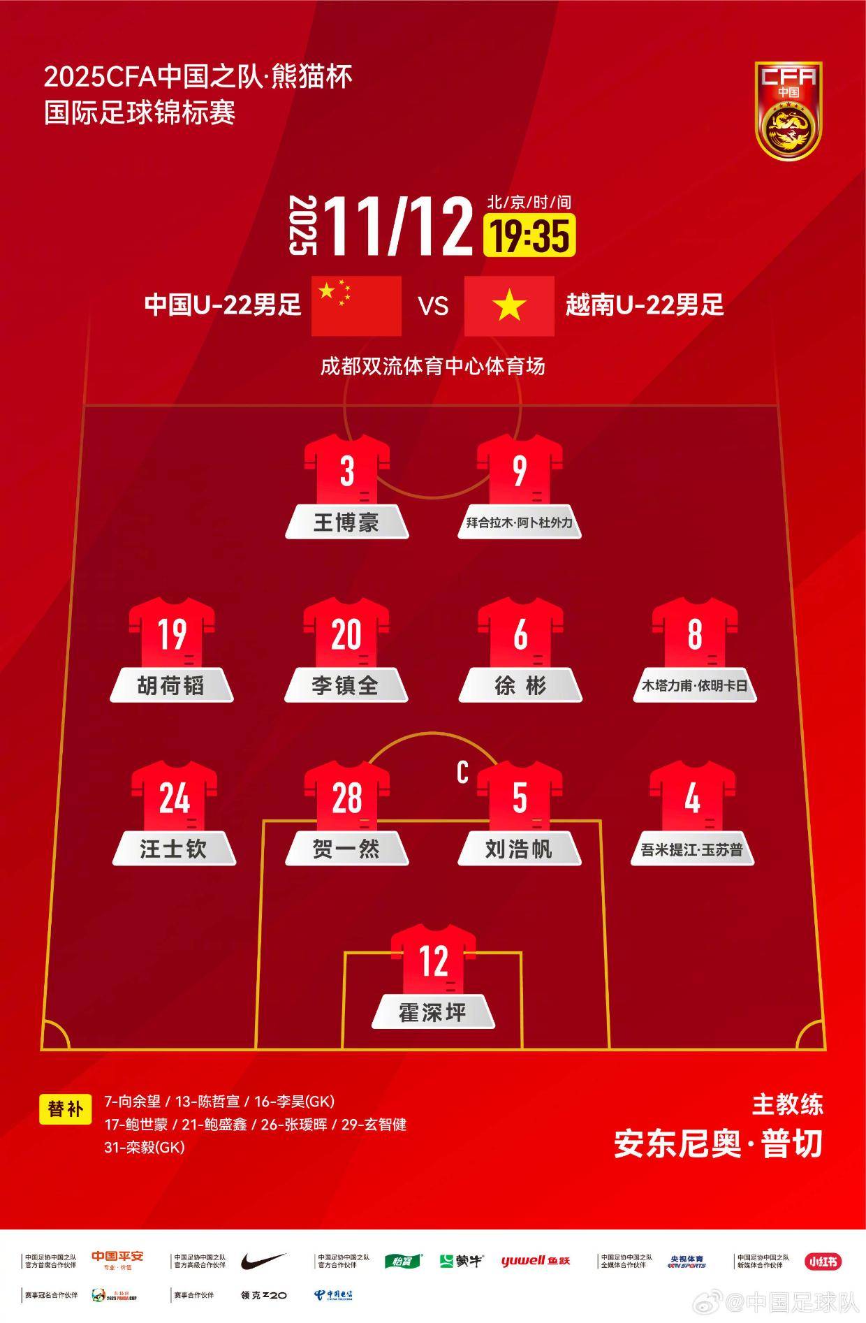 U22国足首发:12-霍深坪、19-胡荷韬、4-吾米提江、5-刘浩帆、24-汪士钦、28-贺一然、3-王博豪(71’ 7-向余望)、6-徐彬(86’ 13-陈哲宣)、20-李镇全、8-木塔力甫(81’ 17-鲍世蒙)、9-拜合拉木;